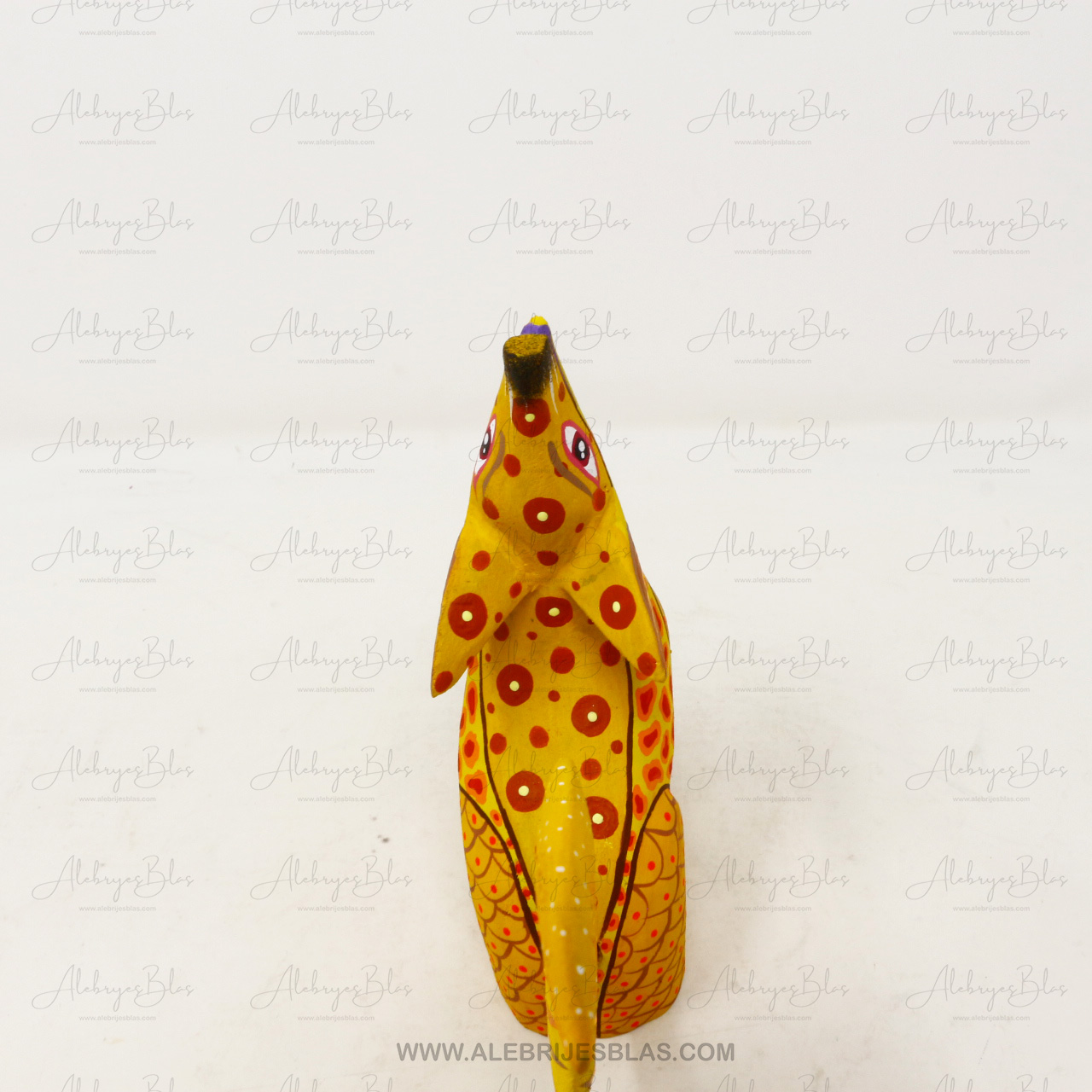 Las figuras de madera (actualmente nombradas tonas y nahuales), son artesanías mexicanas del estado de Oaxaca, seres imaginarios conformados por elementos fisionómicos de animales diferentes, una combinación de varios animales, no solo fantásticos sino también reales que forman un ser alucinante. En cada Alebrije plasmamos nuestro corazón, nuestra historia y la herencia cultural de nuestros ancestros zapotecas, con la única finalidad de brindar piezas únicas.Este Alebrije tiene colores muy pintorescos y llamativos al puro estilo oaxaqueño.