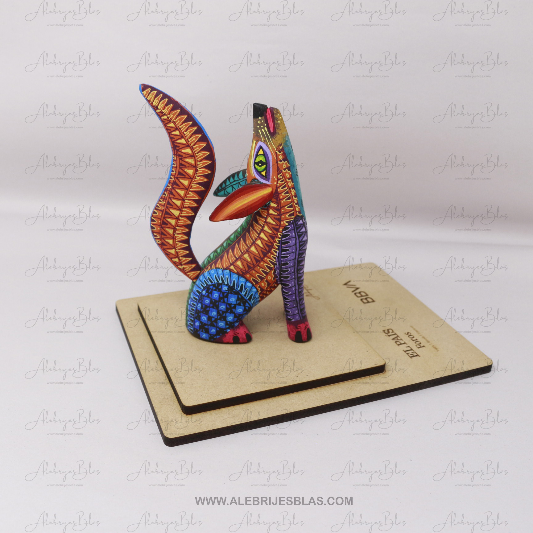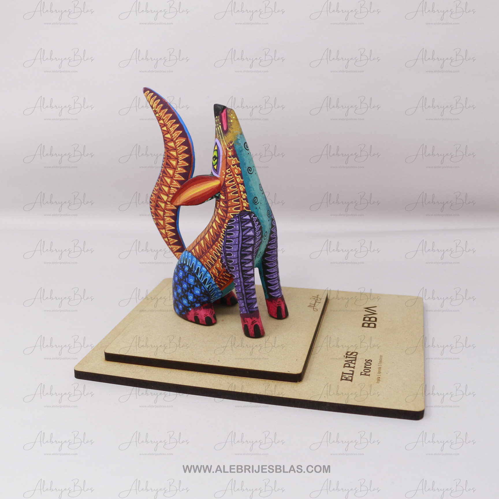Alebrije Coyote zapoteco tallado en madera de copal y pintado finamente a mano con técnicas artesanales por maestros artesanos del taller AlebrijeBlas.