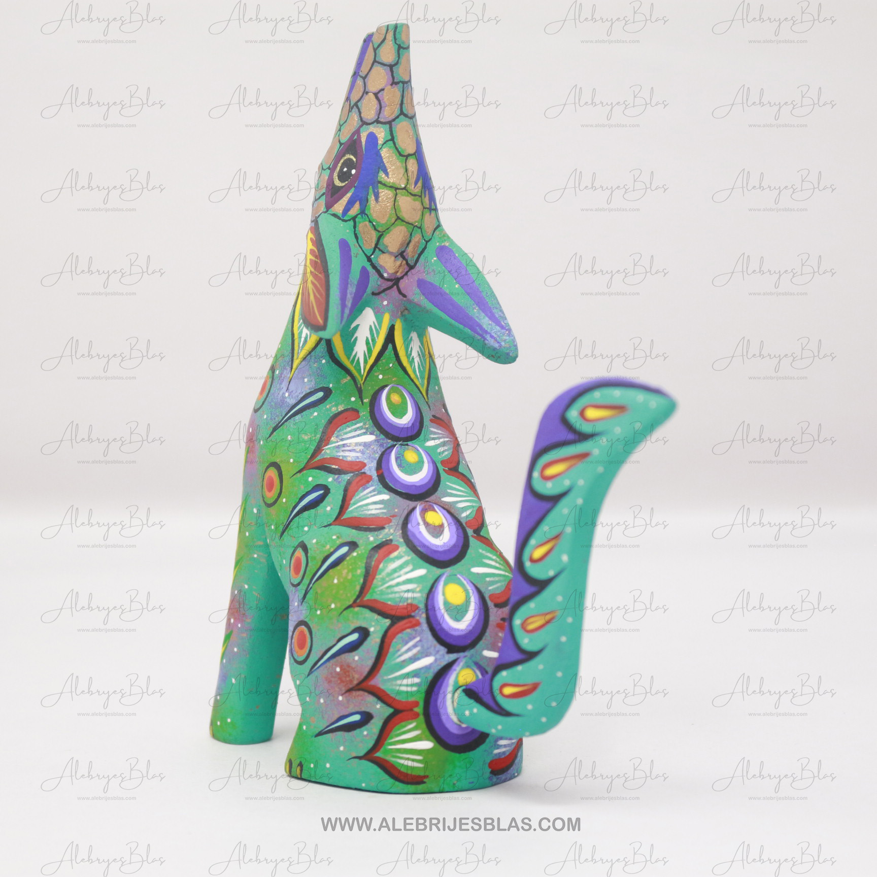 Las figuras de madera (actualmente nombradas tonas y nahuales), son artesanías mexicanas del estado de Oaxaca, seres imaginarios conformados por elementos fisionómicos de animales diferentes, una combinación de varios animales, no solo fantásticos sino también reales que forman un ser alucinante. En cada Alebrije plasmamos nuestro corazón, nuestra historia y la herencia cultural de nuestros ancestros zapotecas, con la única finalidad de brindar piezas únicas.Este Alebrije tiene colores muy pintorescos y llamativos al puro estilo oaxaqueño.