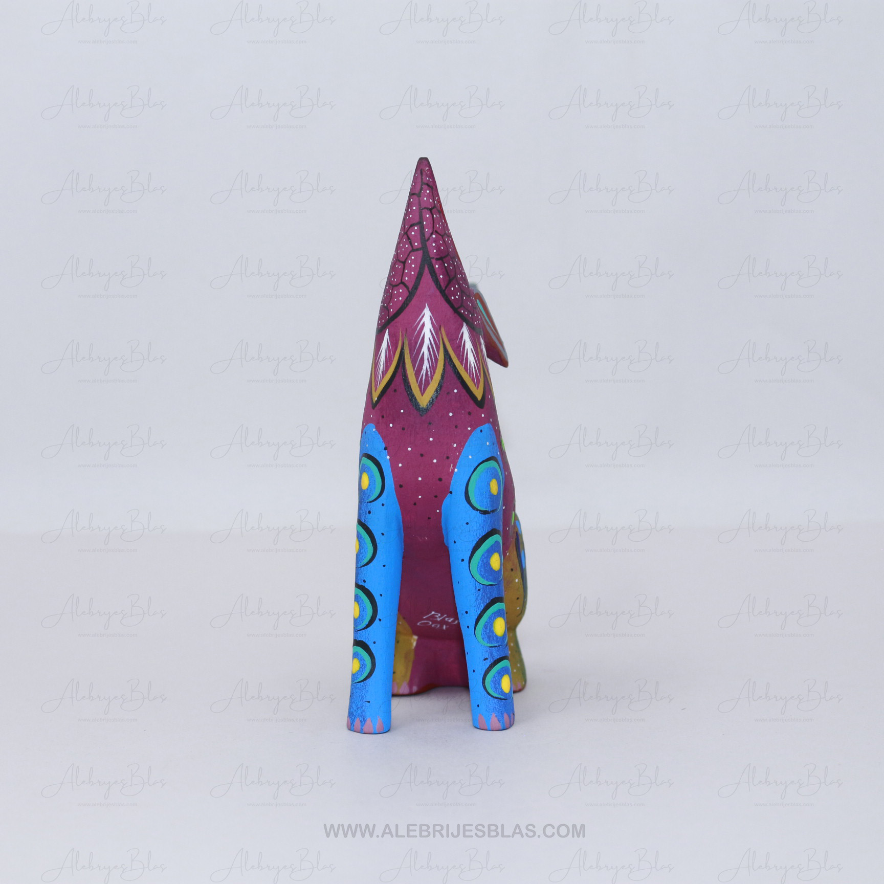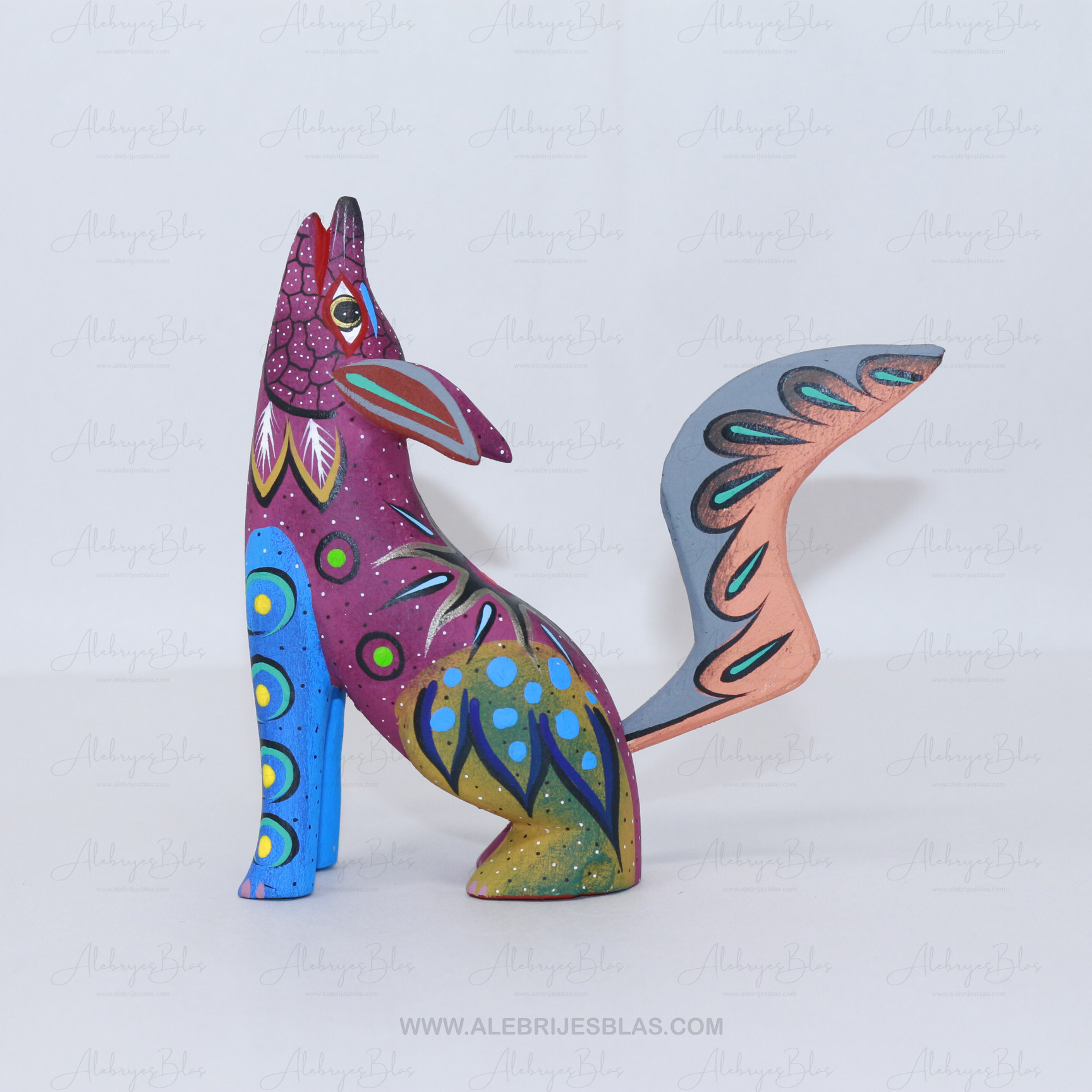 Las figuras de madera (actualmente nombradas tonas y nahuales), son artesanías mexicanas del estado de Oaxaca, seres imaginarios conformados por elementos fisionómicos de animales diferentes, una combinación de varios animales, no solo fantásticos sino también reales que forman un ser alucinante. En cada Alebrije plasmamos nuestro corazón, nuestra historia y la herencia cultural de nuestros ancestros zapotecas, con la única finalidad de brindar piezas únicas.Este Alebrije tiene colores muy pintorescos y llamativos al puro estilo oaxaqueño.