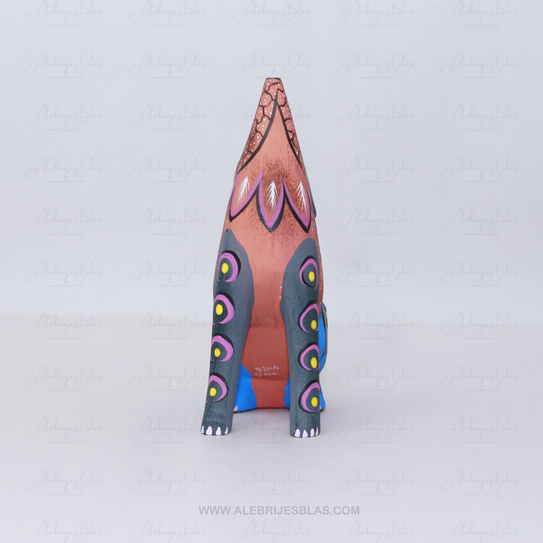 Las figuras de madera (actualmente nombradas tonas y nahuales), son artesanías mexicanas del estado de Oaxaca, seres imaginarios conformados por elementos fisionómicos de animales diferentes, una combinación de varios animales, no solo fantásticos sino también reales que forman un ser alucinante. En cada Alebrije plasmamos nuestro corazón, nuestra historia y la herencia cultural de nuestros ancestros zapotecas, con la única finalidad de brindar piezas únicas.Este Alebrije tiene colores muy pintorescos y llamativos al puro estilo oaxaqueño.