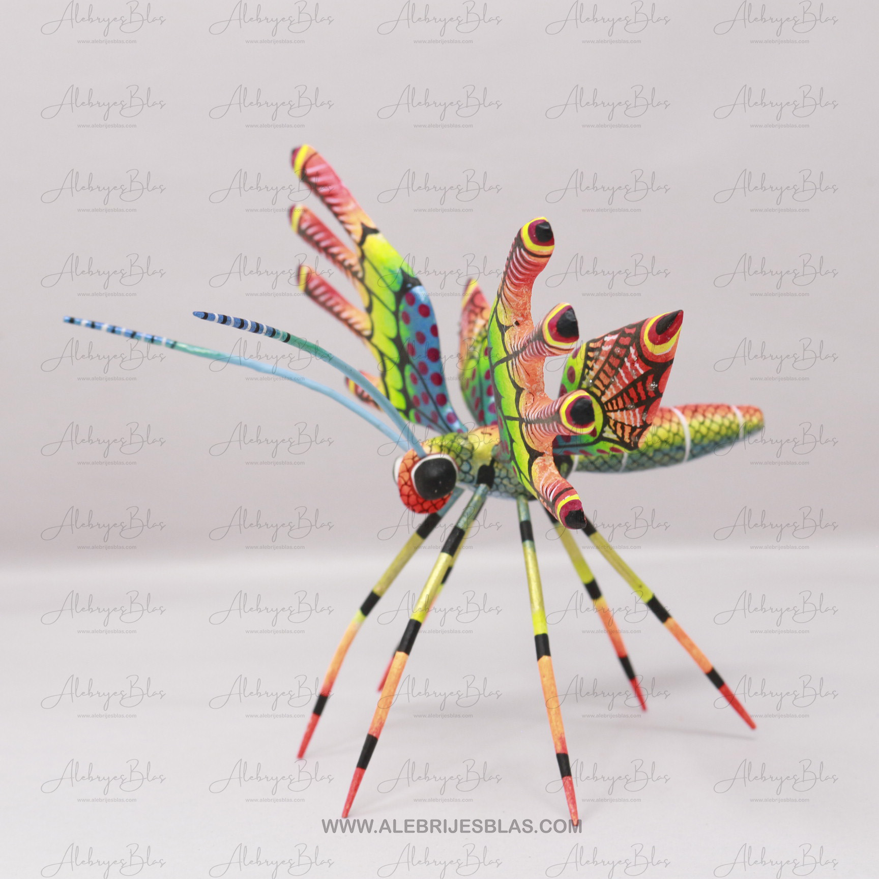 Las figuras de madera (actualmente nombradas tonas y nahuales), son artesanías mexicanas del estado de Oaxaca, seres imaginarios conformados por elementos fisionómicos de animales diferentes, una combinación de varios animales, no solo fantásticos sino también reales que forman un ser alucinante. En cada Alebrije plasmamos nuestro corazón, nuestra historia y la herencia cultural de nuestros ancestros zapotecas, con la única finalidad de brindar piezas únicas.Este Alebrije tiene colores muy pintorescos y llamativos al puro estilo oaxaqueño.