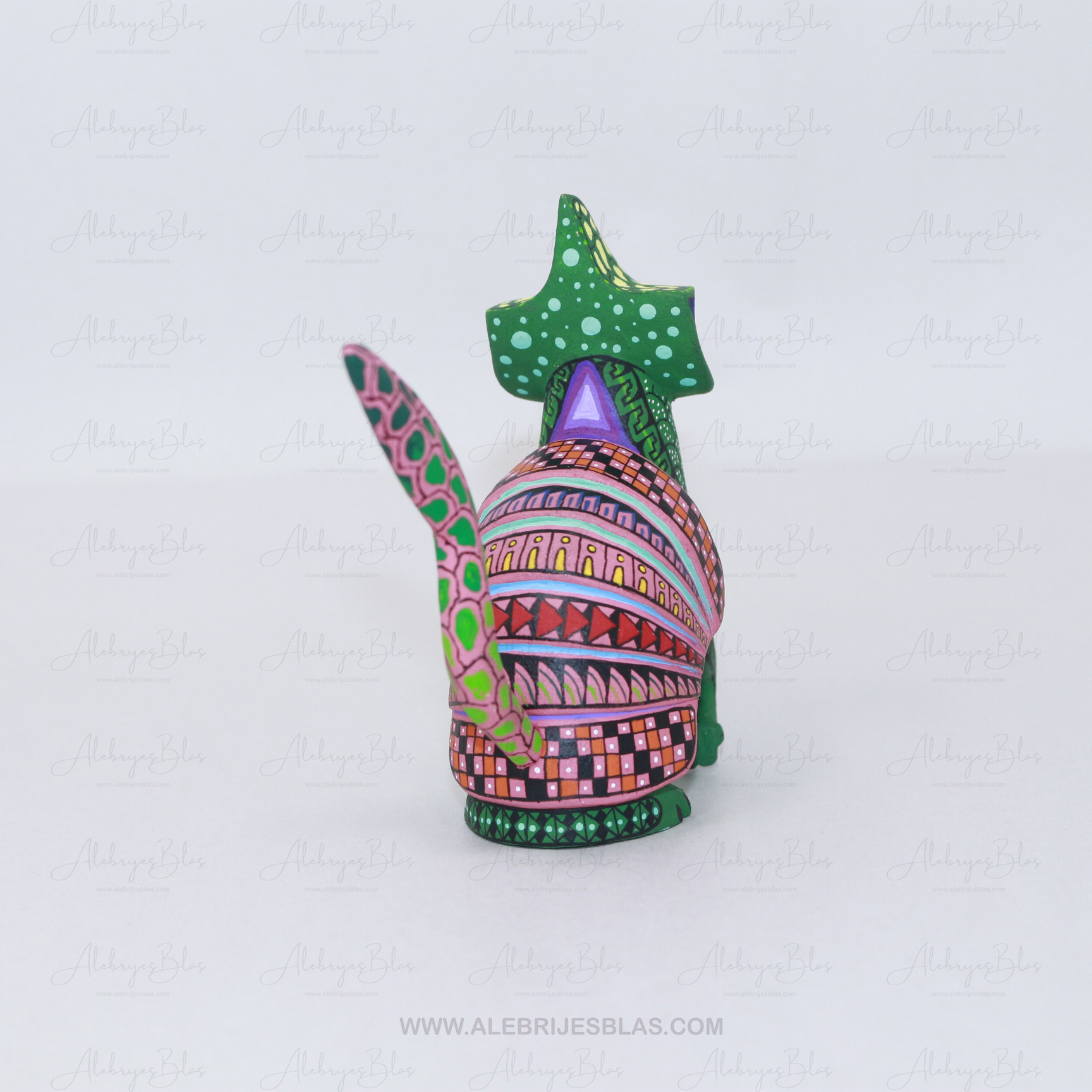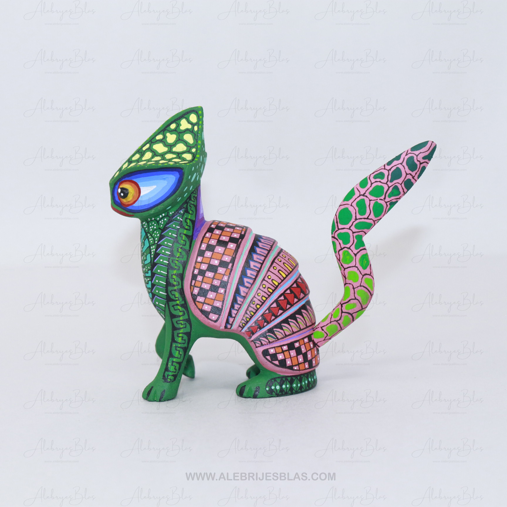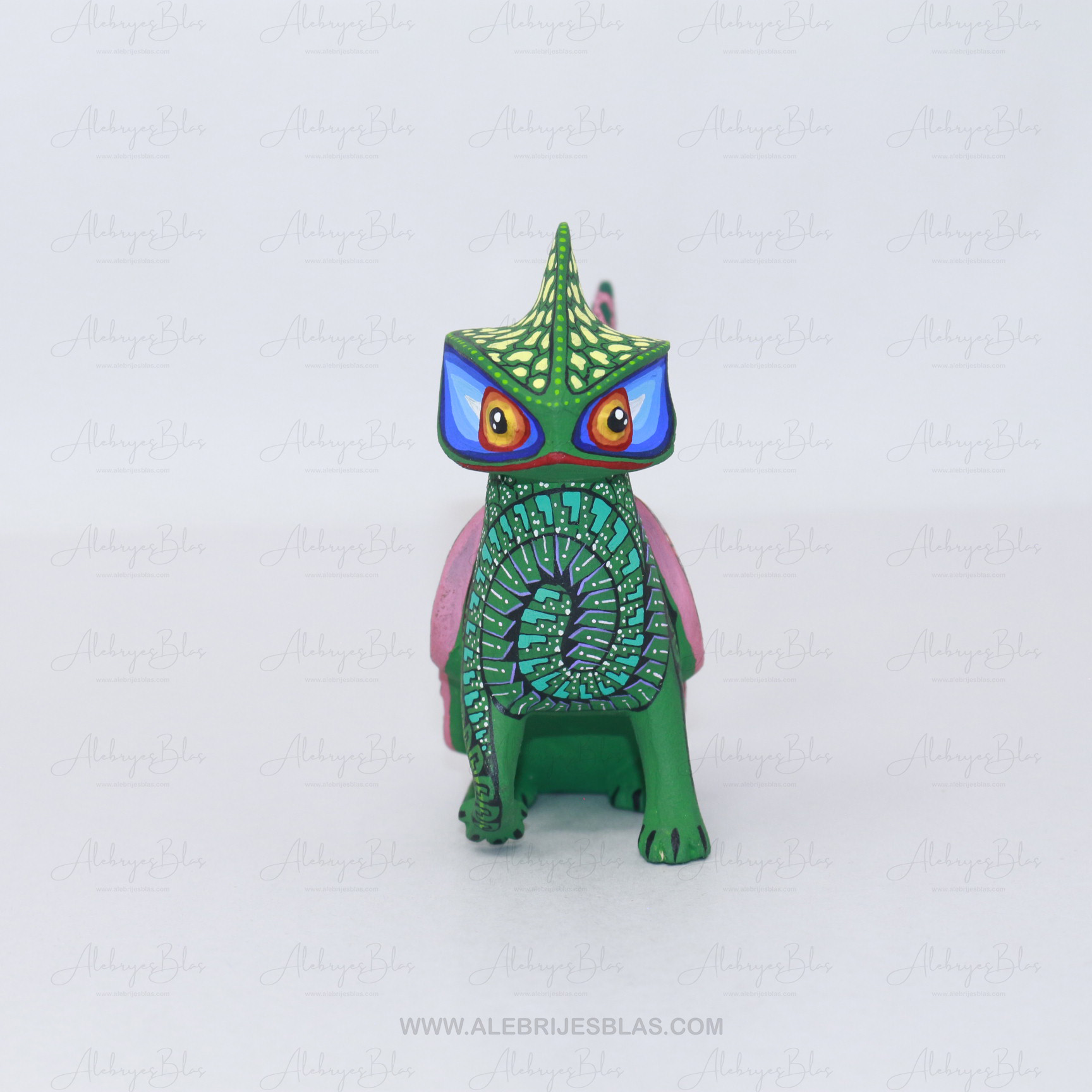 Las figuras de madera (actualmente nombradas tonas y nahuales), son artesanías mexicanas del estado de Oaxaca, seres imaginarios conformados por elementos fisionómicos de animales diferentes, una combinación de varios animales, no solo fantásticos sino también reales que forman un ser alucinante. En cada Alebrije plasmamos nuestro corazón, nuestra historia y la herencia cultural de nuestros ancestros zapotecas, con la única finalidad de brindar piezas únicas.Este Alebrije tiene colores muy pintorescos y llamativos al puro estilo oaxaqueño.