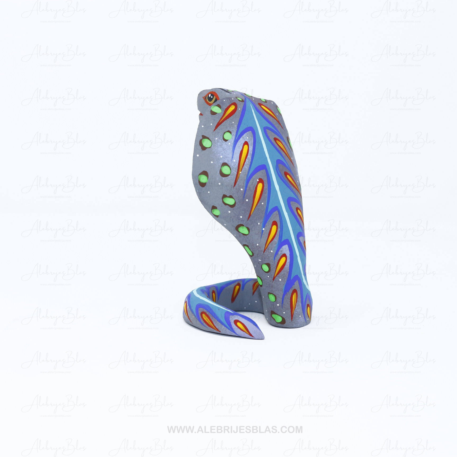 Las figuras de madera (actualmente nombradas tonas y nahuales), son artesanías mexicanas del estado de Oaxaca, seres imaginarios conformados por elementos fisionómicos de animales diferentes, una combinación de varios animales, no solo fantásticos sino también reales que forman un ser alucinante. En cada Alebrije plasmamos nuestro corazón, nuestra historia y la herencia cultural de nuestros ancestros zapotecas, con la única finalidad de brindar piezas únicas.Este Alebrije tiene colores muy pintorescos y llamativos al puro estilo oaxaqueño.