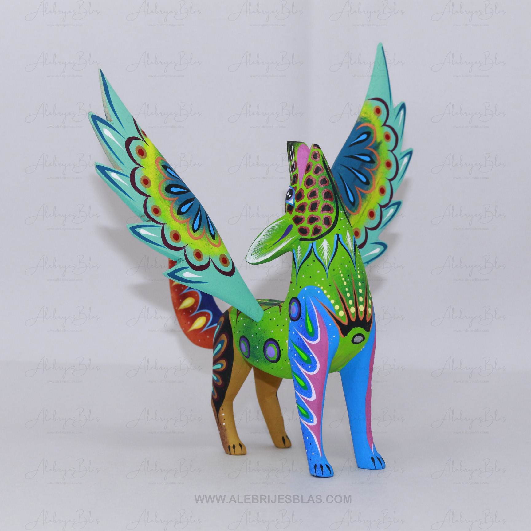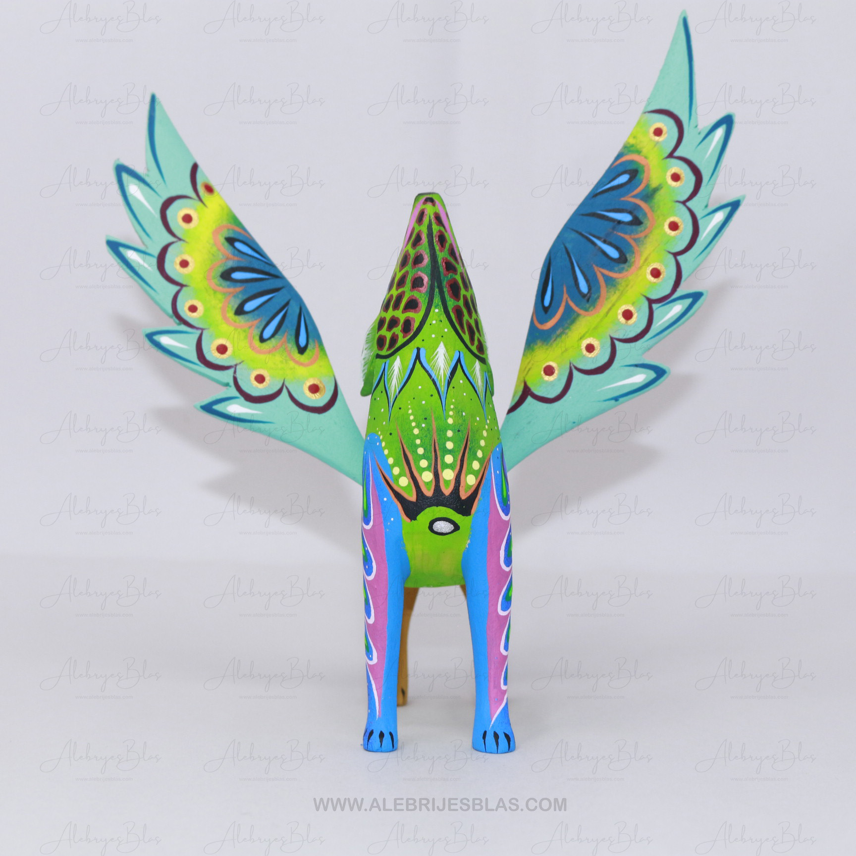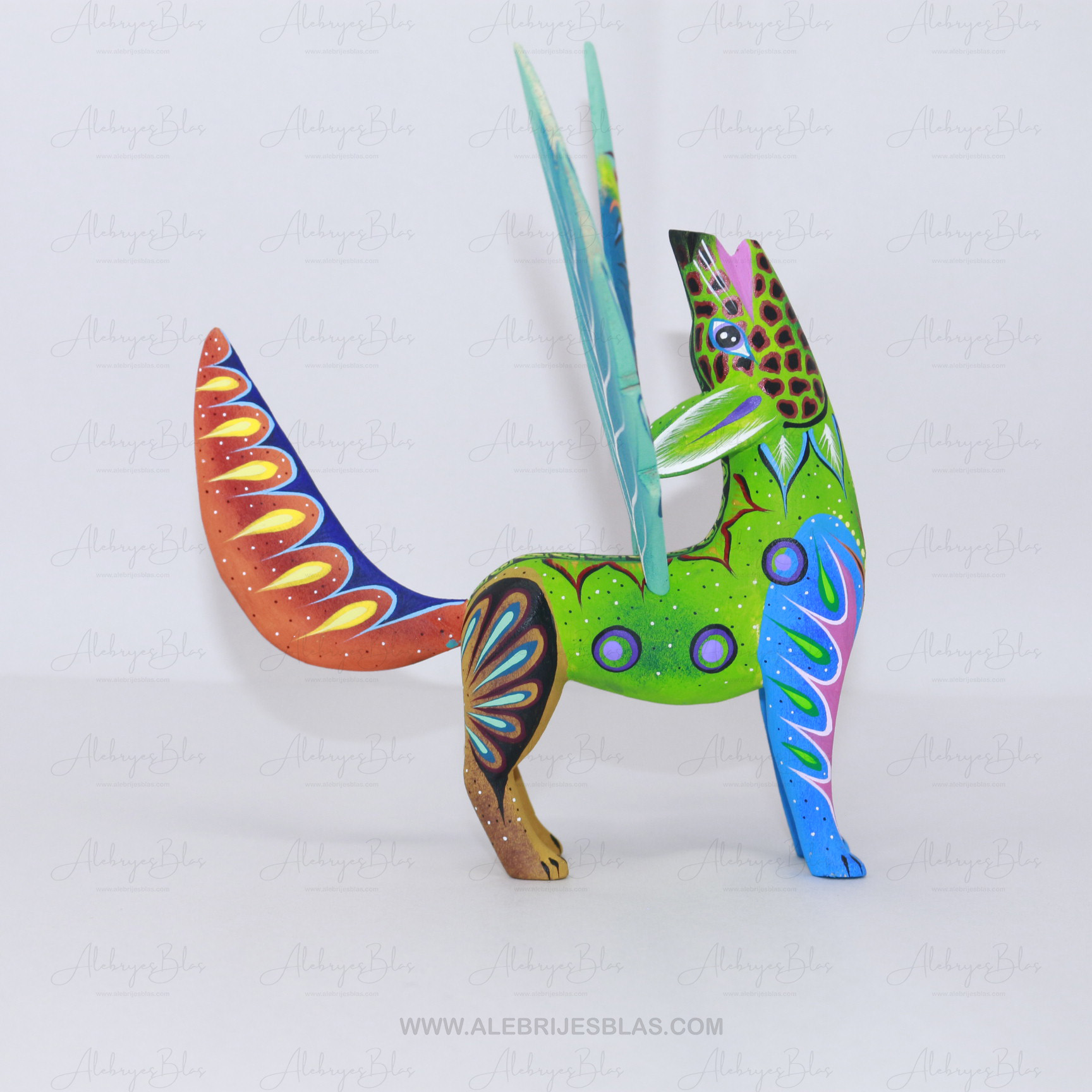 Las figuras de madera (actualmente nombradas tonas y nahuales), son artesanías mexicanas del estado de Oaxaca, seres imaginarios conformados por elementos fisionómicos de animales diferentes, una combinación de varios animales, no solo fantásticos sino también reales que forman un ser alucinante. En cada Alebrije plasmamos nuestro corazón, nuestra historia y la herencia cultural de nuestros ancestros zapotecas, con la única finalidad de brindar piezas únicas.Este Alebrije tiene colores muy pintorescos y llamativos al puro estilo oaxaqueño.