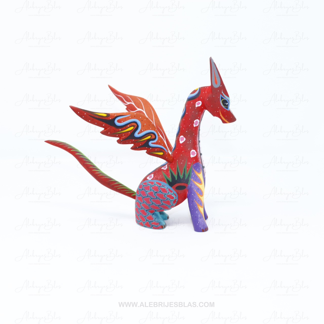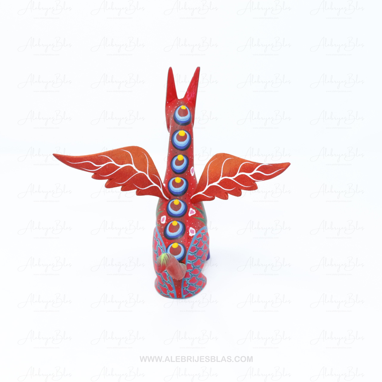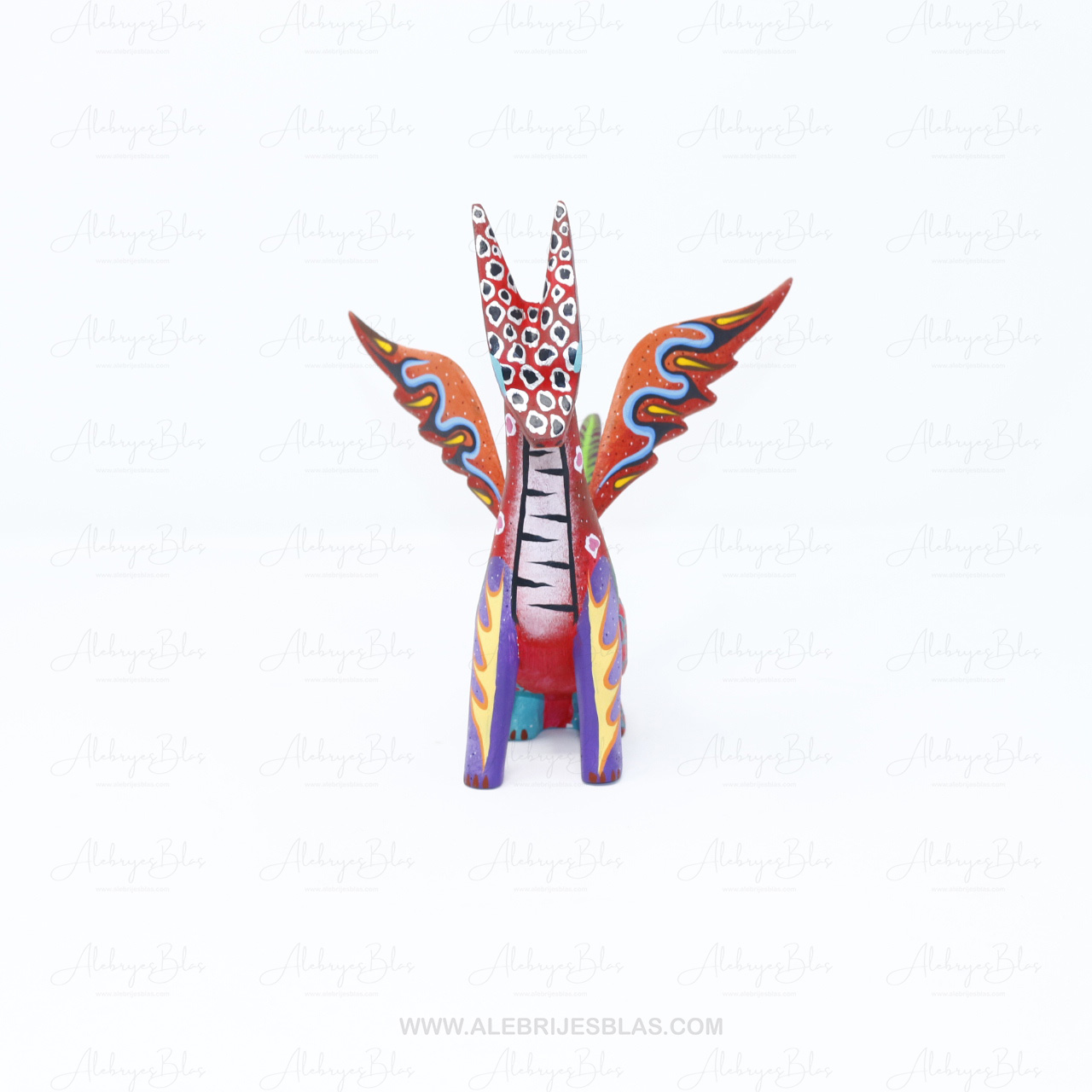 Las figuras de madera (actualmente nombradas tonas y nahuales), son artesanías mexicanas del estado de Oaxaca, seres imaginarios conformados por elementos fisionómicos de animales diferentes, una combinación de varios animales, no solo fantásticos sino también reales que forman un ser alucinante. En cada Alebrije plasmamos nuestro corazón, nuestra historia y la herencia cultural de nuestros ancestros zapotecas, con la única finalidad de brindar piezas únicas.Este Alebrije tiene colores muy pintorescos y llamativos al puro estilo oaxaqueño.
