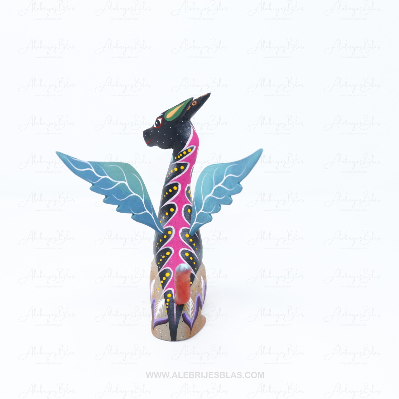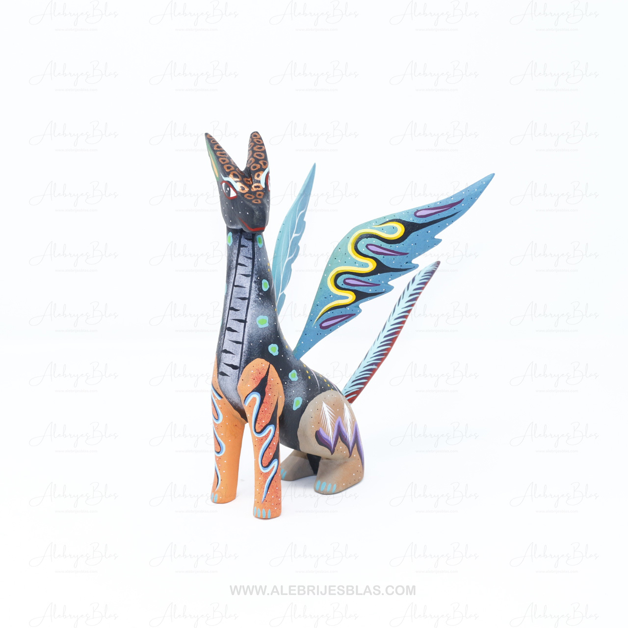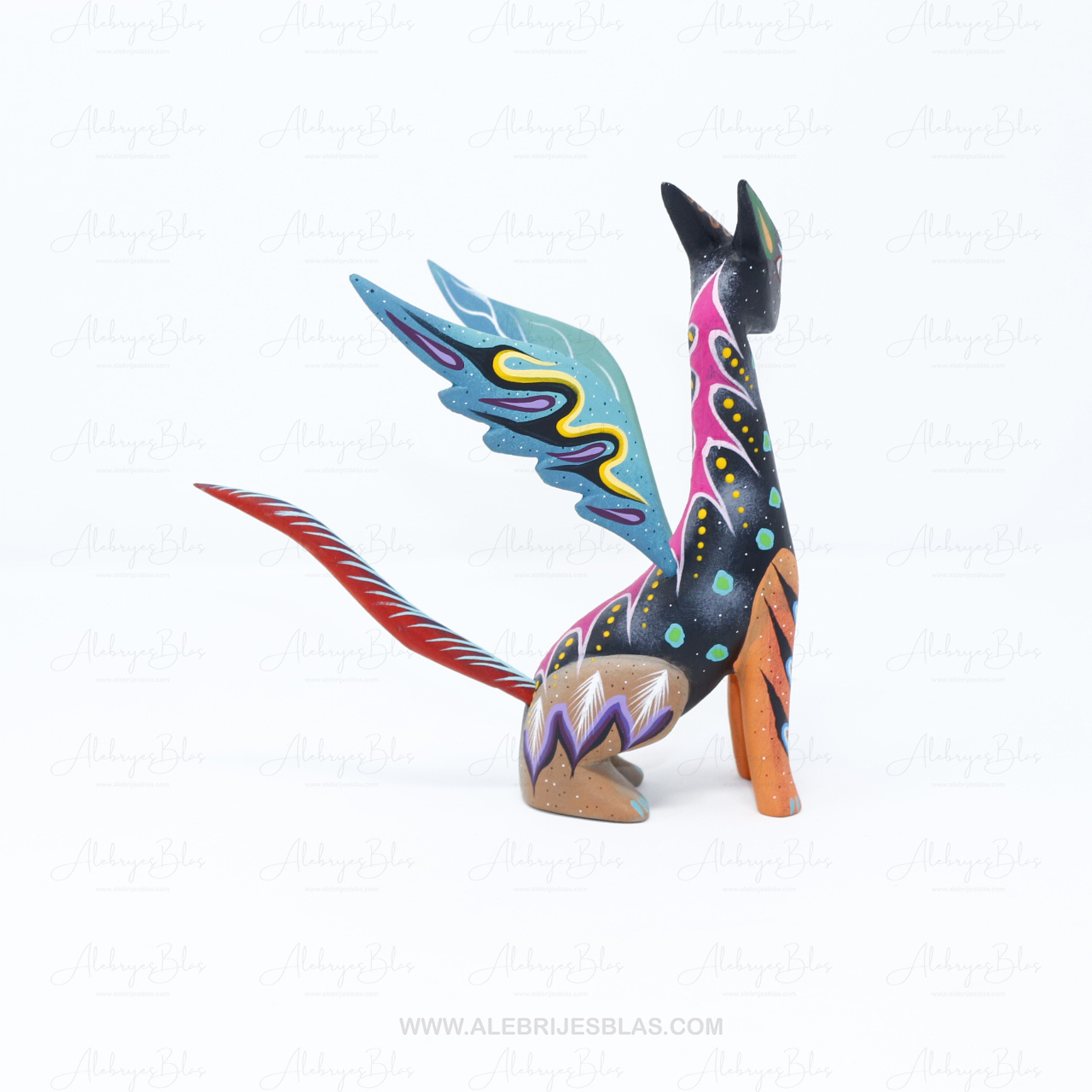 Las figuras de madera (actualmente nombradas tonas y nahuales), son artesanías mexicanas del estado de Oaxaca, seres imaginarios conformados por elementos fisionómicos de animales diferentes, una combinación de varios animales, no solo fantásticos sino también reales que forman un ser alucinante. En cada Alebrije plasmamos nuestro corazón, nuestra historia y la herencia cultural de nuestros ancestros zapotecas, con la única finalidad de brindar piezas únicas.Este Alebrije tiene colores muy pintorescos y llamativos al puro estilo oaxaqueño.