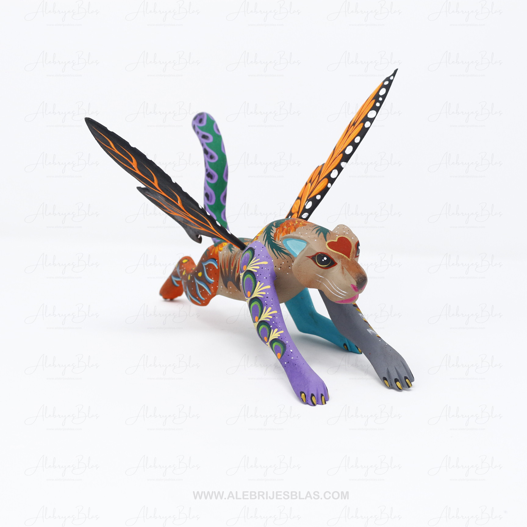 Las figuras de madera (actualmente nombradas tonas y nahuales), son artesanías mexicanas del estado de Oaxaca, seres imaginarios conformados por elementos fisionómicos de animales diferentes, una combinación de varios animales, no solo fantásticos sino también reales que forman un ser alucinante. En cada Alebrije plasmamos nuestro corazón, nuestra historia y la herencia cultural de nuestros ancestros zapotecas, con la única finalidad de brindar piezas únicas.Este Alebrije tiene colores muy pintorescos y llamativos al puro estilo oaxaqueño.