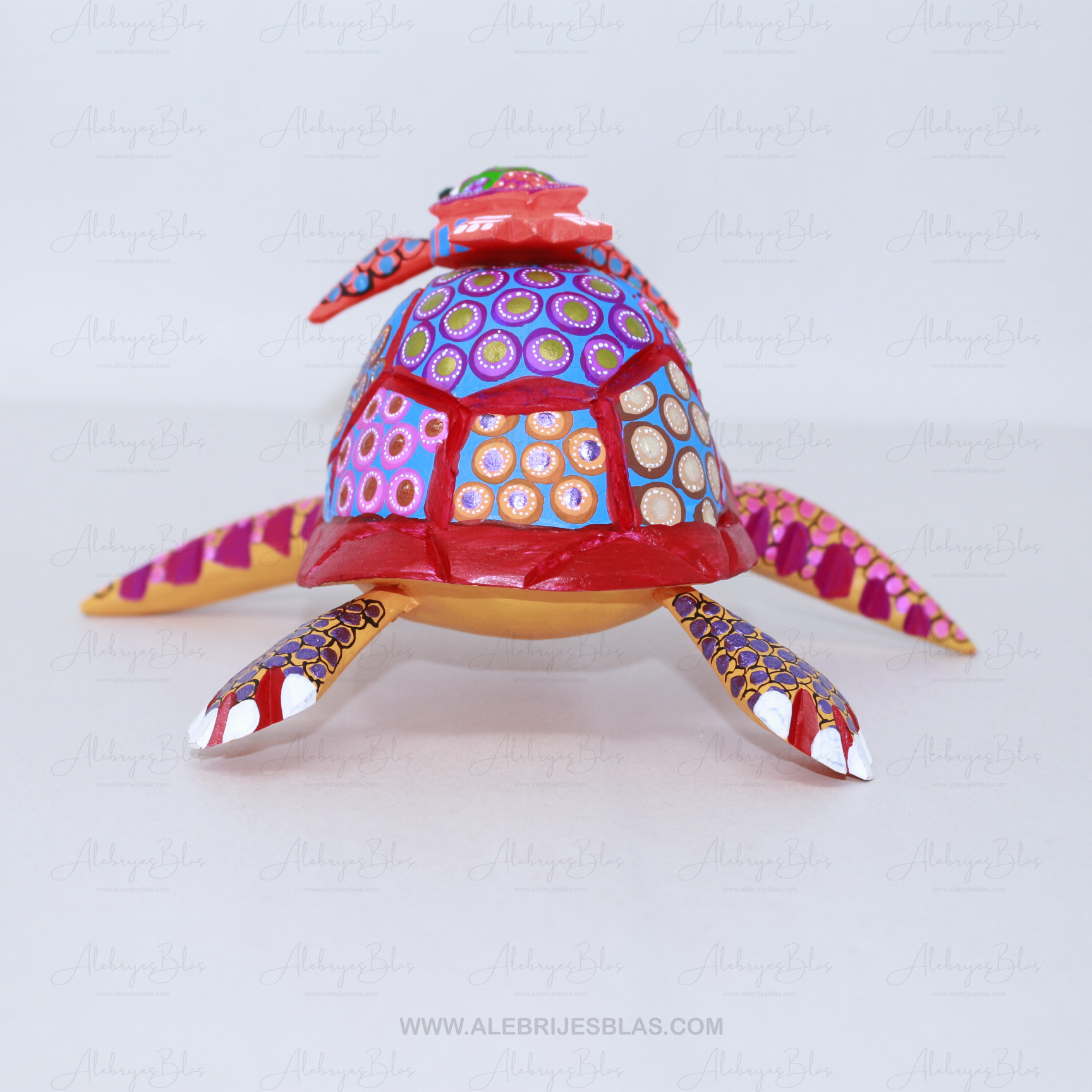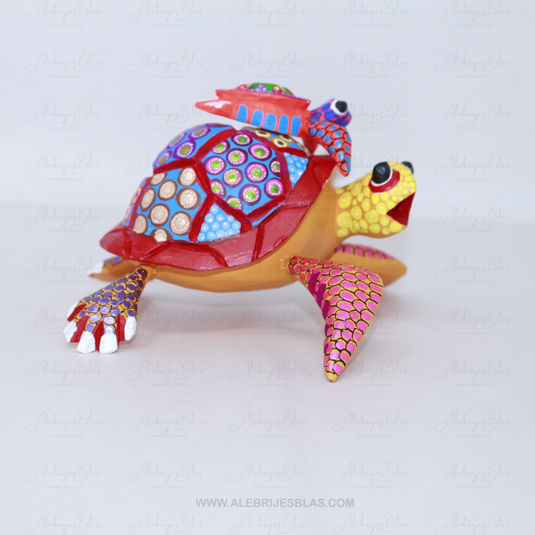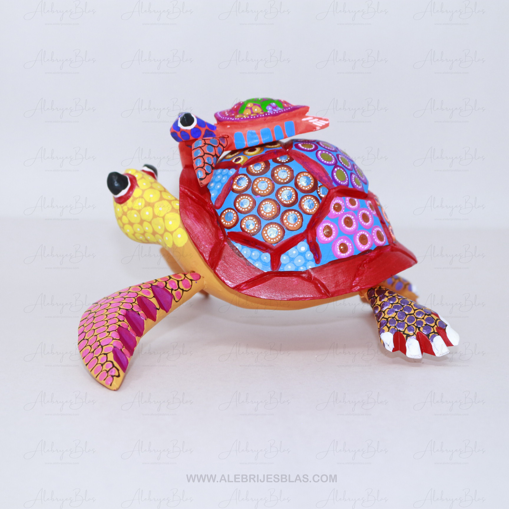 Las figuras de madera (actualmente nombradas tonas y nahuales), son artesanías mexicanas del estado de Oaxaca, seres imaginarios conformados por elementos fisionómicos de animales diferentes, una combinación de varios animales, no solo fantásticos sino también reales que forman un ser alucinante. En cada Alebrije plasmamos nuestro corazón, nuestra historia y la herencia cultural de nuestros ancestros zapotecas, con la única finalidad de brindar piezas únicas.Este Alebrije tiene colores muy pintorescos y llamativos al puro estilo oaxaqueño.