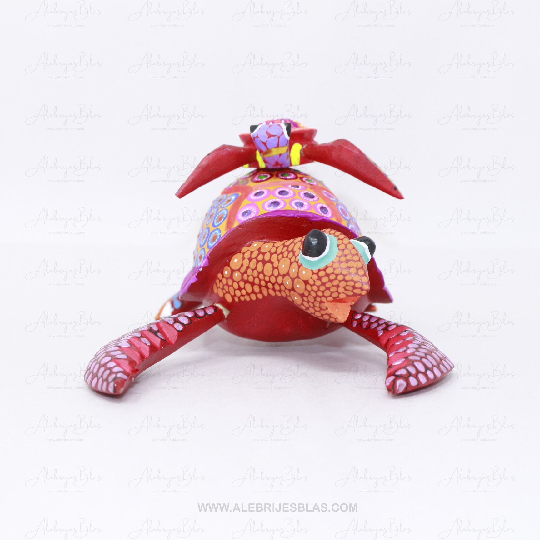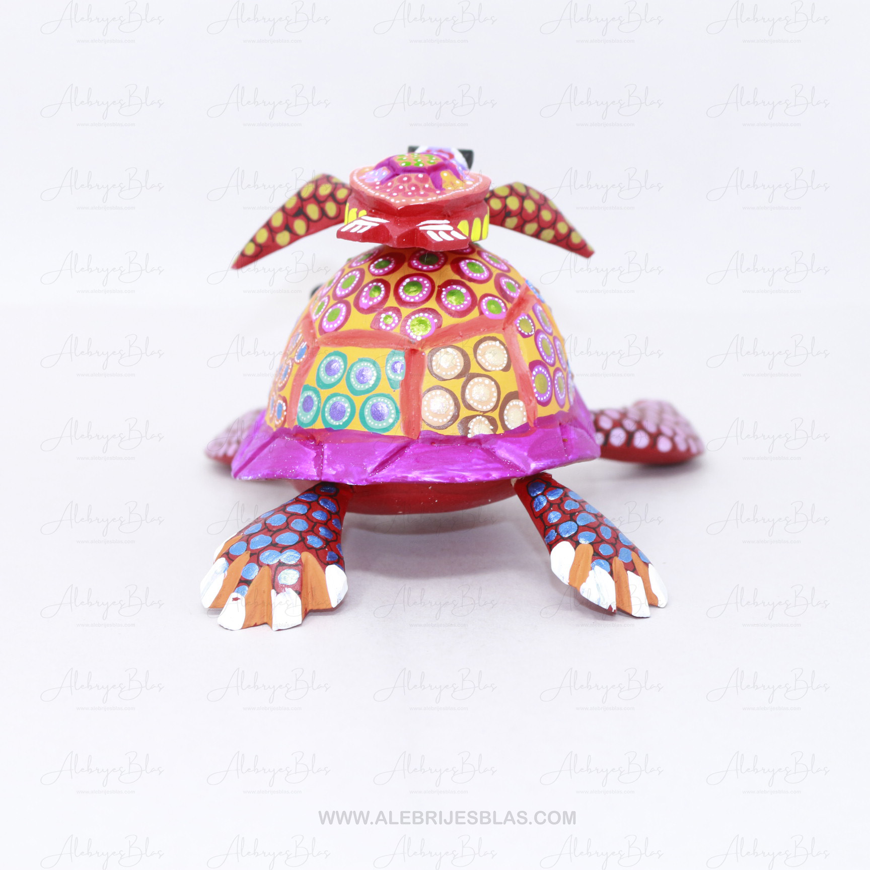 Las figuras de madera (actualmente nombradas tonas y nahuales), son artesanías mexicanas del estado de Oaxaca, seres imaginarios conformados por elementos fisionómicos de animales diferentes, una combinación de varios animales, no solo fantásticos sino también reales que forman un ser alucinante. En cada Alebrije plasmamos nuestro corazón, nuestra historia y la herencia cultural de nuestros ancestros zapotecas, con la única finalidad de brindar piezas únicas.Este Alebrije tiene colores muy pintorescos y llamativos al puro estilo oaxaqueño.