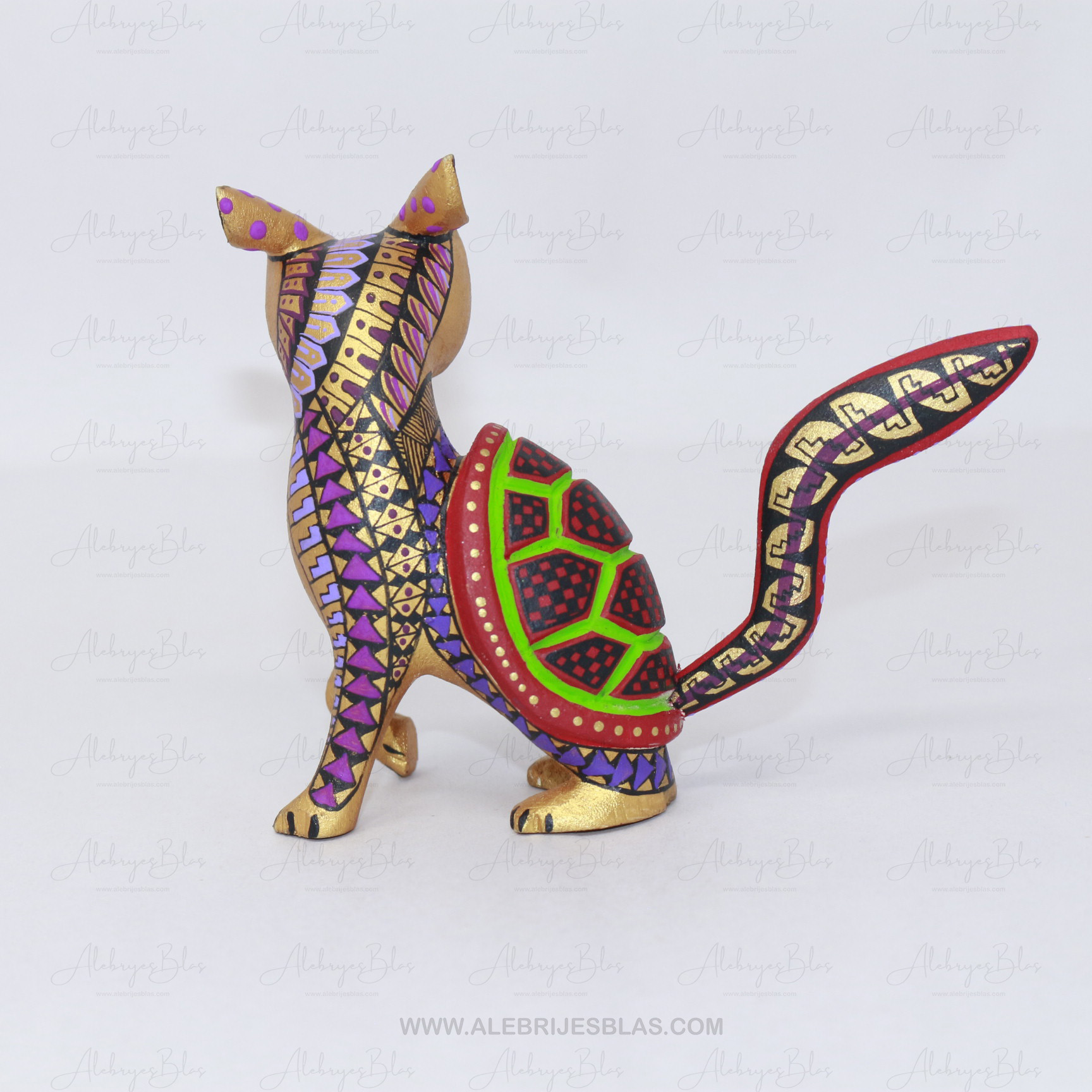 Las figuras de madera (actualmente nombradas tonas y nahuales), son artesanías mexicanas del estado de Oaxaca, seres imaginarios conformados por elementos fisionómicos de animales diferentes, una combinación de varios animales, no solo fantásticos sino también reales que forman un ser alucinante. En cada Alebrije plasmamos nuestro corazón, nuestra historia y la herencia cultural de nuestros ancestros zapotecas, con la única finalidad de brindar piezas únicas.Este Alebrije tiene colores muy pintorescos y llamativos al puro estilo oaxaqueño.