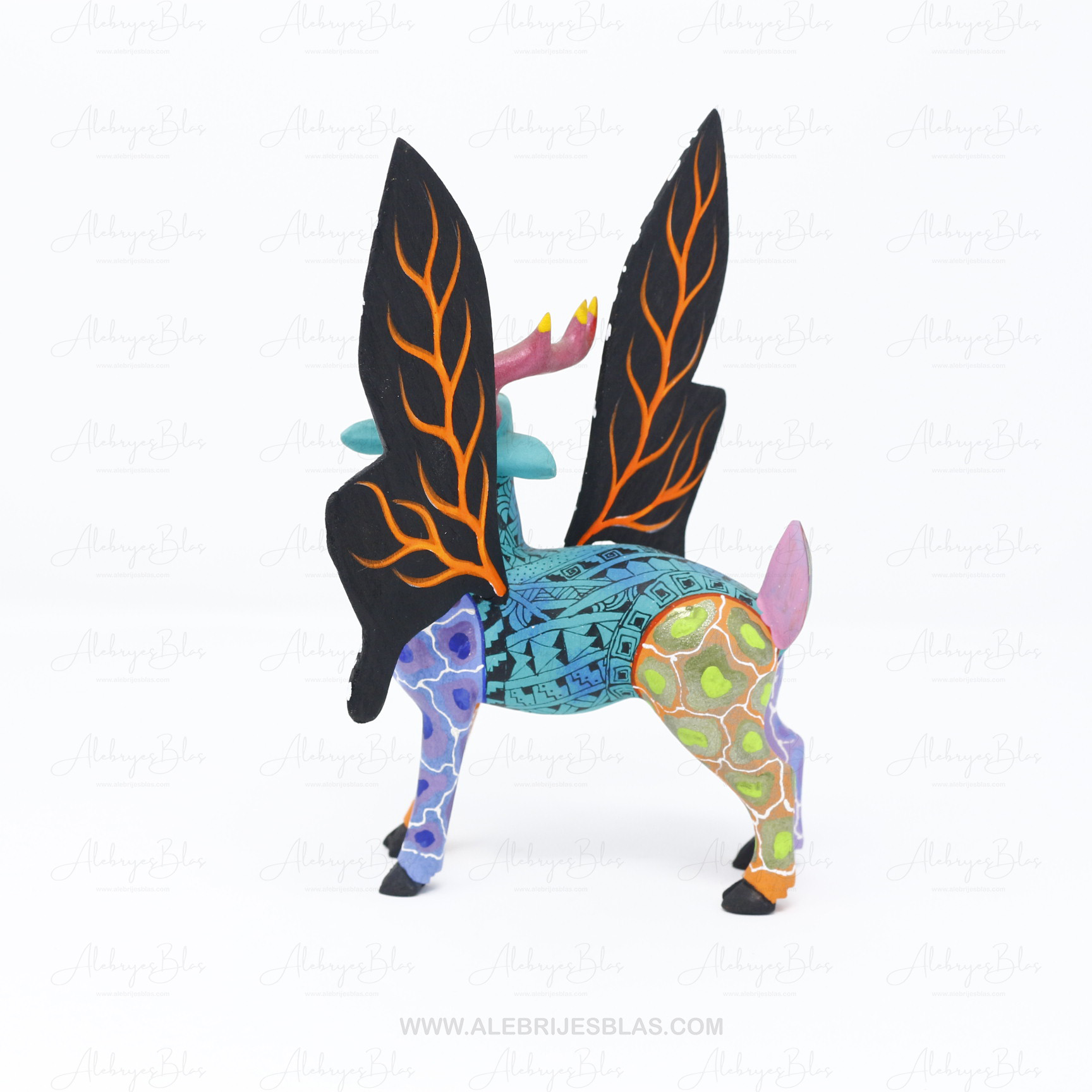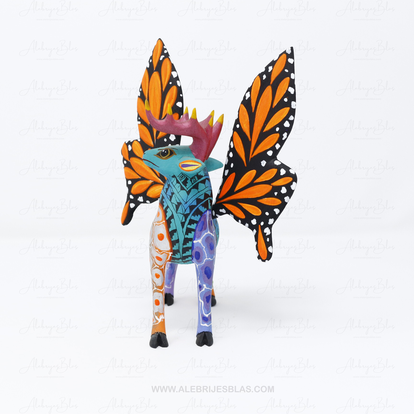 Las figuras de madera (actualmente nombradas tonas y nahuales), son artesanías mexicanas del estado de Oaxaca, seres imaginarios conformados por elementos fisionómicos de animales diferentes, una combinación de varios animales, no solo fantásticos sino también reales que forman un ser alucinante. En cada Alebrije plasmamos nuestro corazón, nuestra historia y la herencia cultural de nuestros ancestros zapotecas, con la única finalidad de brindar piezas únicas.Este Alebrije tiene colores muy pintorescos y llamativos al puro estilo oaxaqueño.
