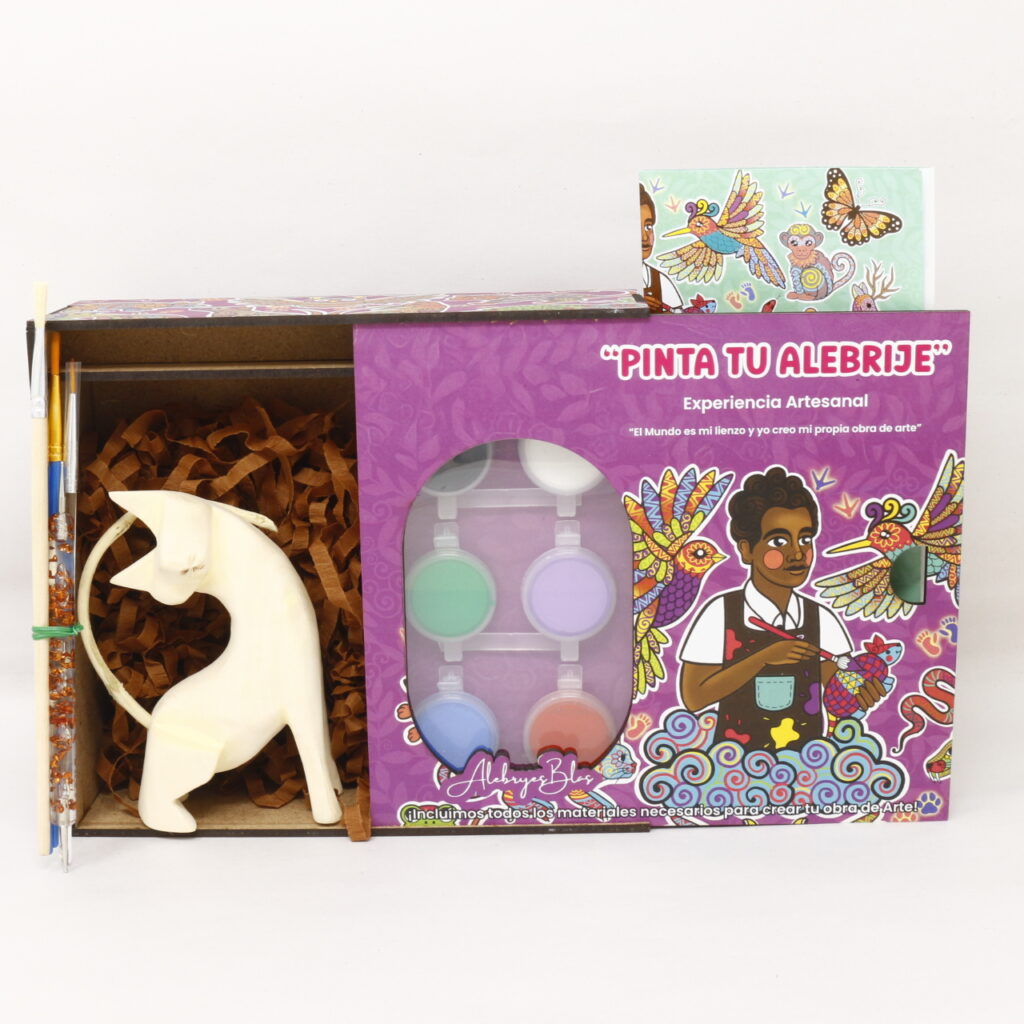 Si no puedes venir a nuestro taller, llevamos la experiencia hasta ti. El Kit Pinta tu Alebrije incluye la figura de madera tallada, pinceles, pinturas y todo lo necesario para que pintes tu propia obra desde casa. Perfecto para regalar, para actividades escolares o simplemente para descubrir tu lado creativo. Un recuerdo artesanal que une tradición con diversión.